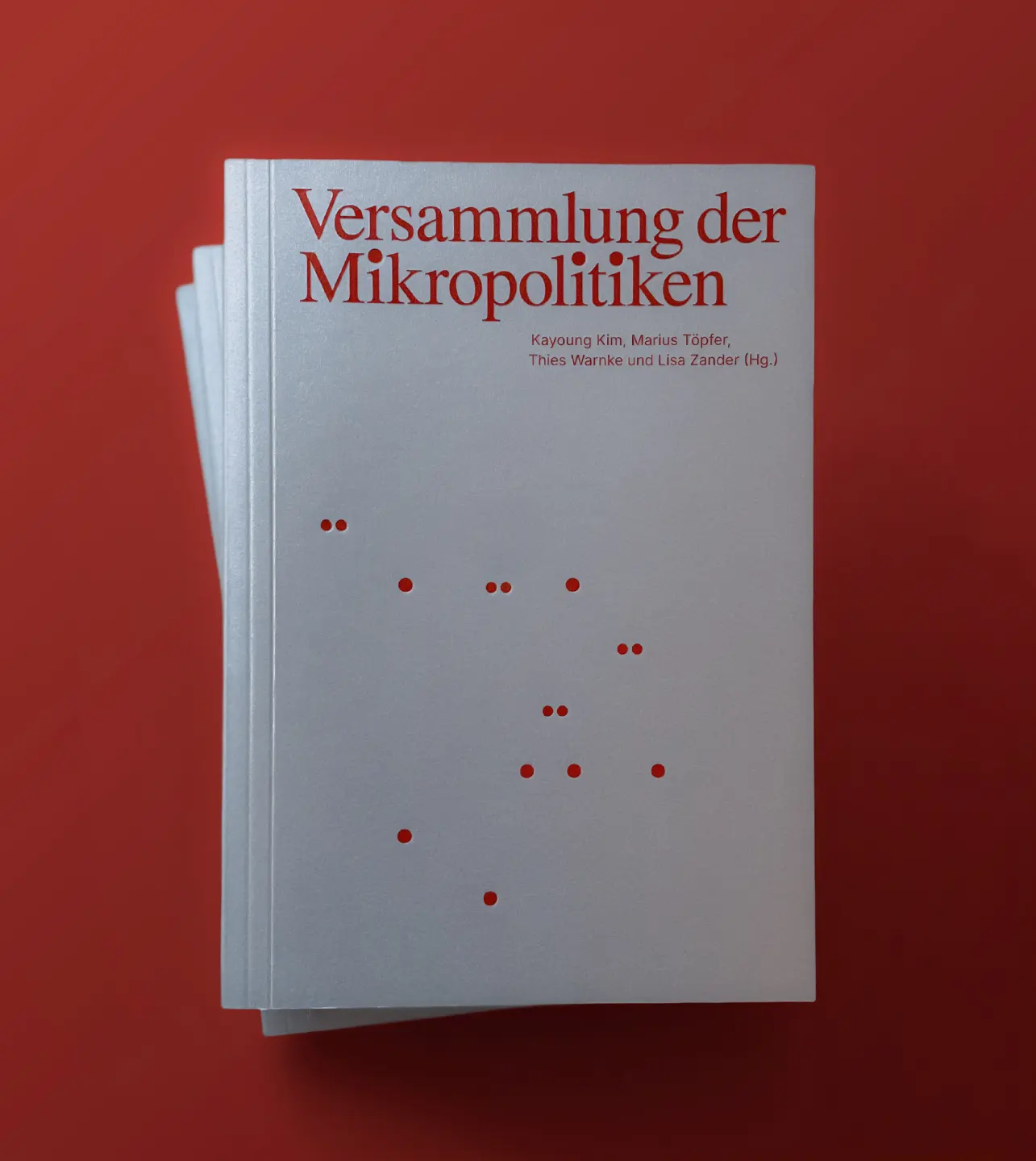 Photo of a stack of books. The books have a shiny silver cover with red type and graphics.