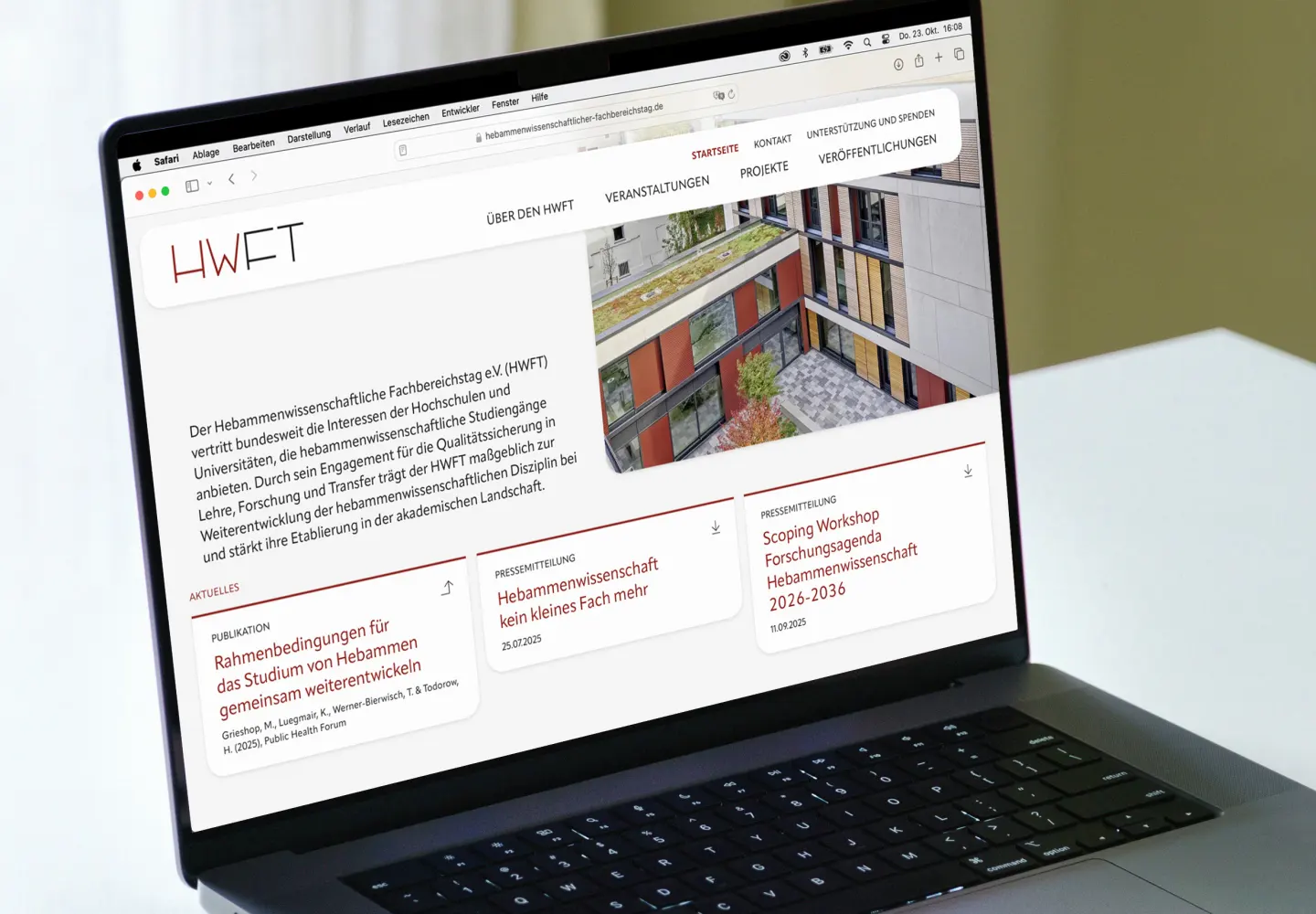 Photo of a laptop on a white desktop. The screen shows a clean, light-coloured website with red highlights.